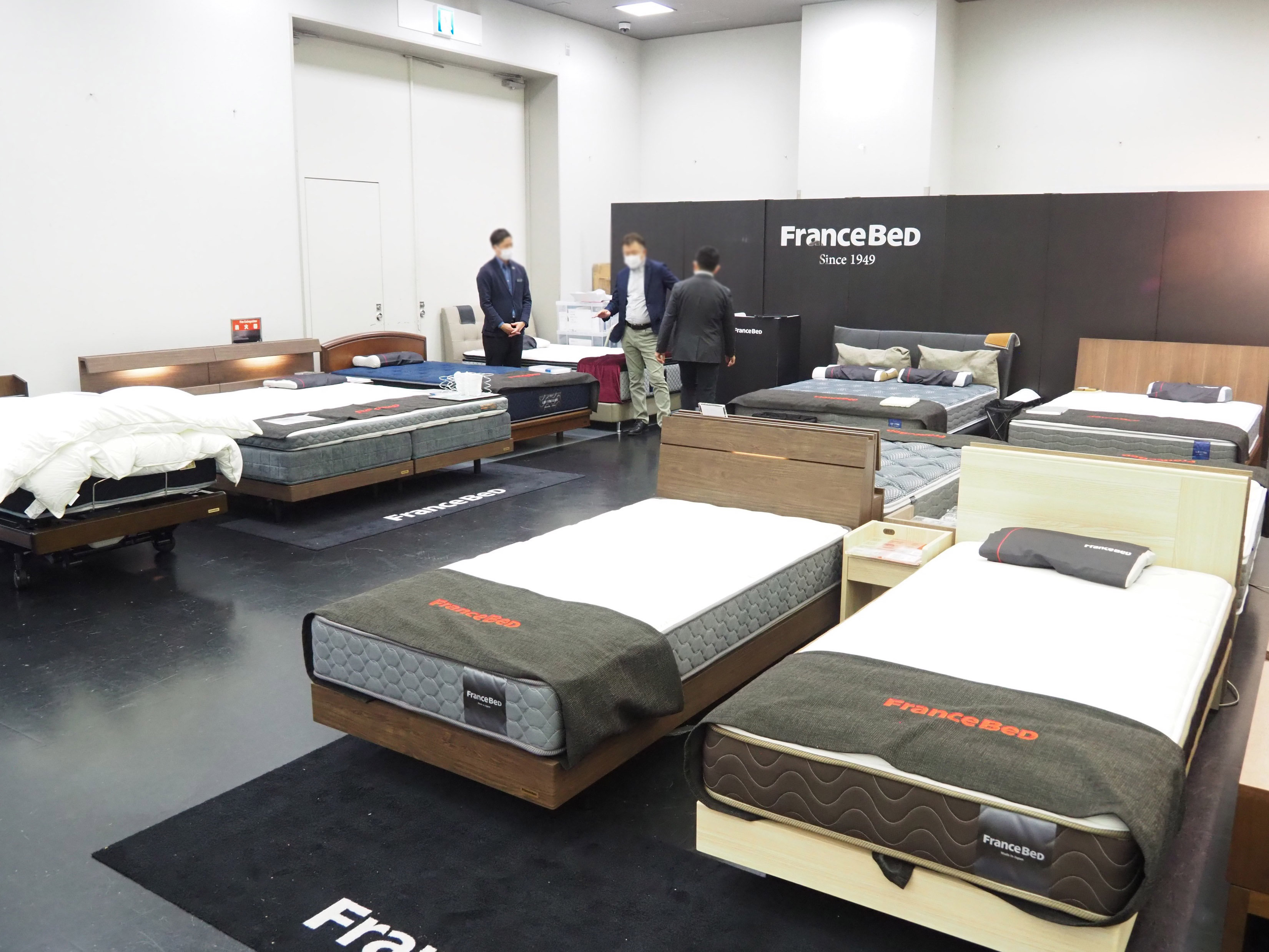 今回は、第1展示場B面を9つのブースに区切り、日本ベッド製造株式会社様のほか、日本フクラ株式会社様、冨士ファニチア株式会社様、柏木工株式会社様、株式会社京都カンディハウス様、株式会社大彌リビング様、株式会社シラカワ様、フランスベッド株式会社様、株式会社Fine-natural様の9社での合同展となりました。