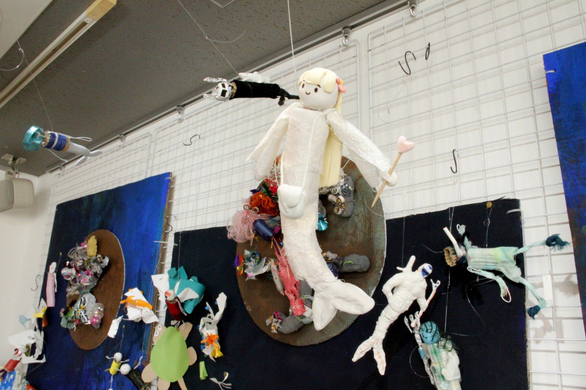紙・布・紙粘土・ワイヤーなど多様な素材を用いた立体作品を、ワイヤーフックやテグスで空間的に構成。
